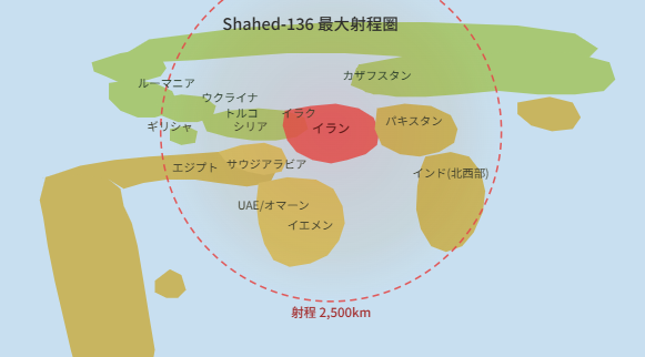 2500kmと侮るなかれ。上掲画像の国々は射程圏内にあり、実際ドバイ(アラブ首長国連邦の首都)は攻撃されたばかりです。