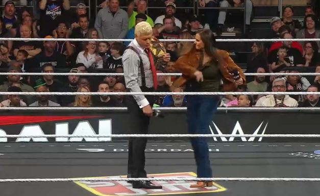 ステファニーマクマホンは”今のままではランディオートンには勝てない!”となぜか確信をもってコーディローズに詰め寄り、その延長でトップ画像のビンタをしたのでした。